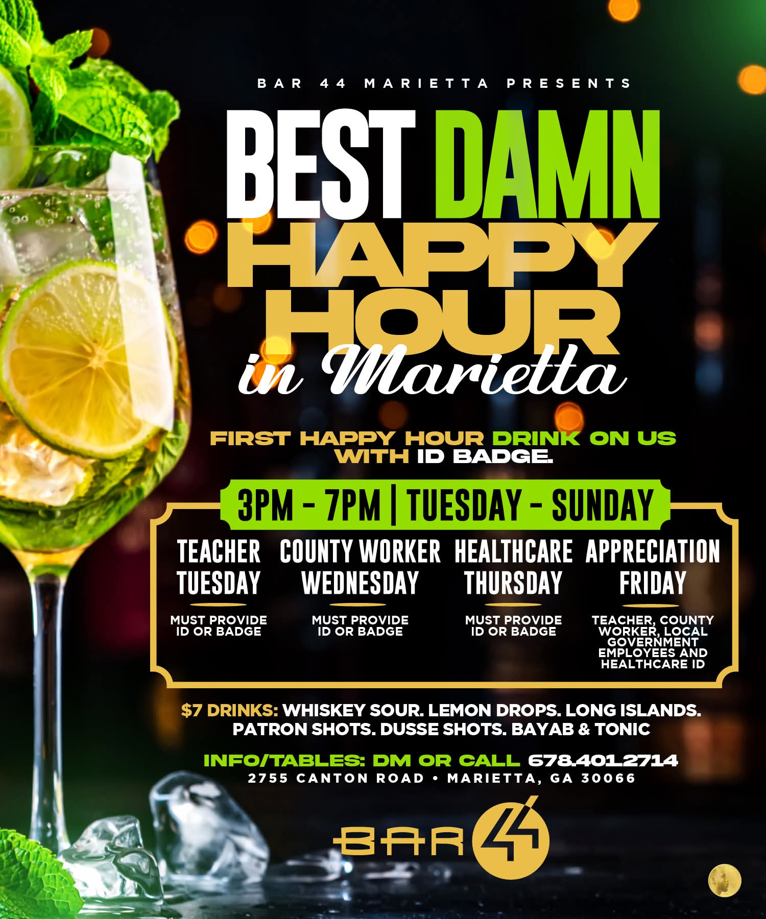 Welcome to Bar 44 Sports Bar & Lounge, Marietta’s hottest new Sports Bar! If you like fun, food, spirits, and sports, you have come to the right place. We are conveniently located at 2755 Canton Rd. in Marietta, GA. Our patrons will love our classy interior design, elegant lounging, and wall-to-wall TV coverage with over 15 large-screen TVs for your game-watching pleasure. Our upscale interior design, elegant lounging, wall to wall tv coverage of your favorite sporting events will engulf our patrons.